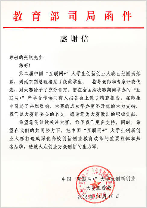 2018年,完美对战平台连续多年为中国国际互联网+大学生创新创业大赛做出积极贡献,获教育部来函致谢。